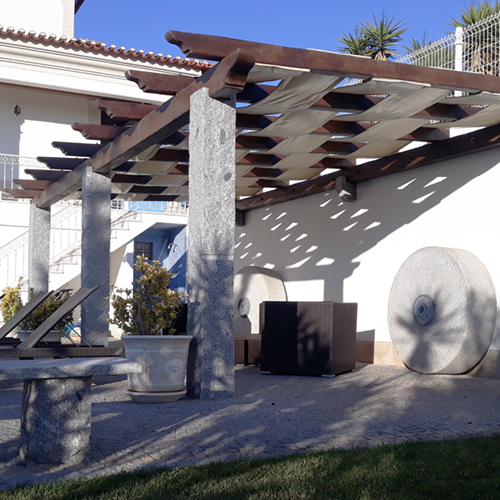Pérgola em betão, com textura de madeira e terminações em papos de rola